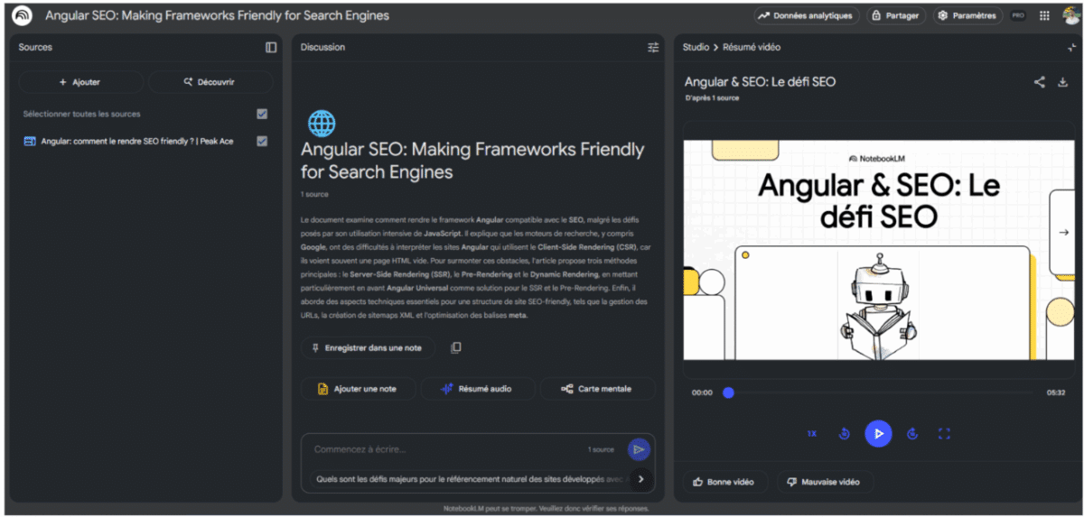 Récemment disponible en français, Google a introduit les Video Overviews, étendant le concept des Audio Overviews au format vidéo. Cette fonctionnalité permet de créer des présentations visuelles dynamiques à partir de vos sources, rendant l’information encore plus accessible et engageante.