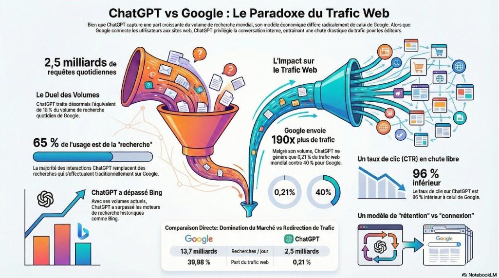 Février 2026 : Ahrefs publie l’autopsie du trafic web. Les chiffres sont sans appel. ChatGPT traite des milliards de requêtes, s’impose dans chaque foyer, et pourtant, il génère 190 fois moins de trafic que Google vers les sites sources.