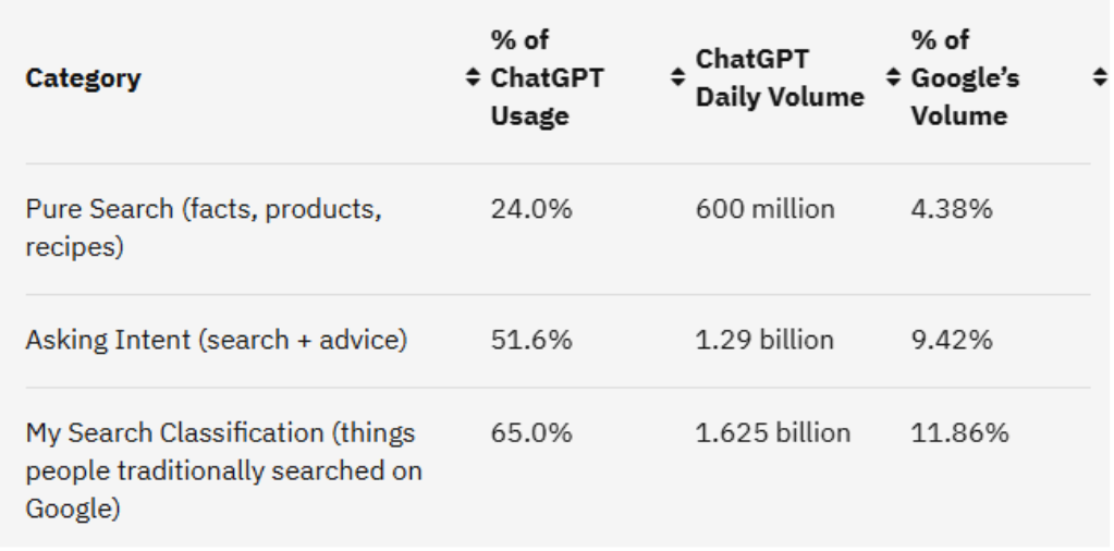 Le comportement utilisateur a muté. Nous ne cherchons plus des liens, nous cherchons un jugement. Selon l’analyse de Patrick Stox, 65 % de l’usage de ChatGPT couvre ce que nous demandions autrefois à Google.