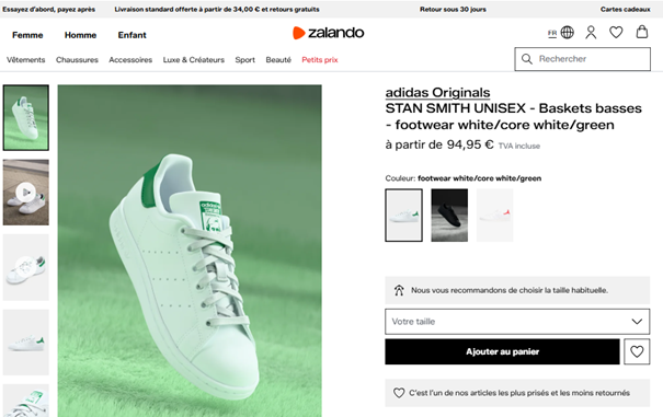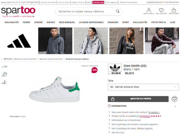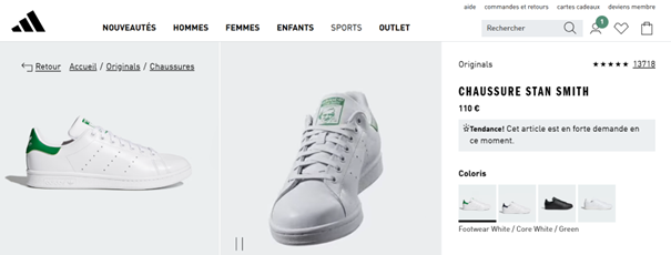 Exemple de fiche produit parfaite déclinée sur plusieurs sites et marketplaces : la Stan Smith d’Adidas