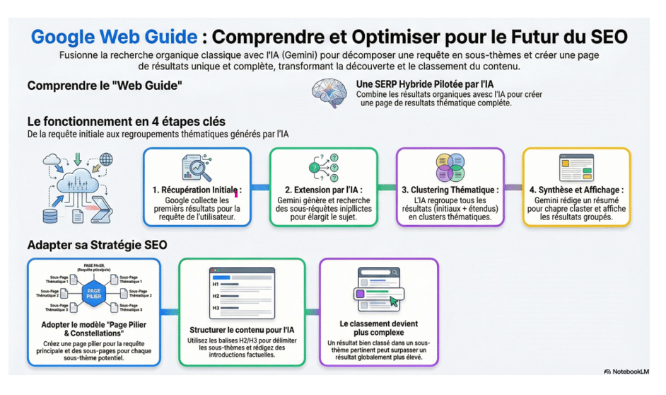 Alors que les fonctionnalités d’IA de Google comme « AI Overview » et « AI Mode » monopolisent l’attention, une évolution plus discrète mais potentiellement plus fondamentale se dessine. Issue des expérimentations de « Google Labs », le « Web Guide » est une fonctionnalité hybride, à la croisée de la recherche organique traditionnelle et de l’intelligence artificielle, qui redéfinit silencieusement les règles du jeu de la visibilité en ligne. Bien plus qu’un simple gadget, elle préfigure un changement de paradigme pour toute stratégie SEO.