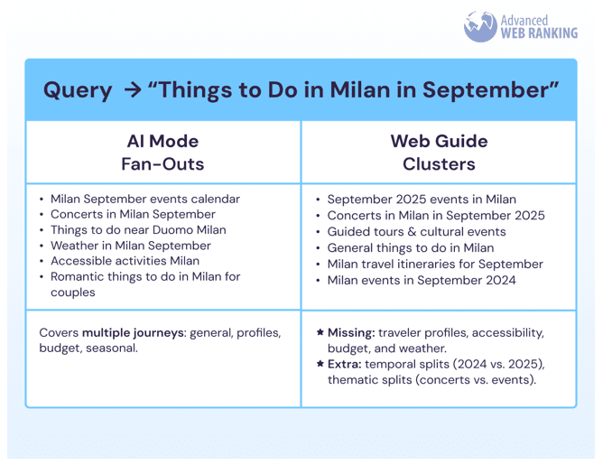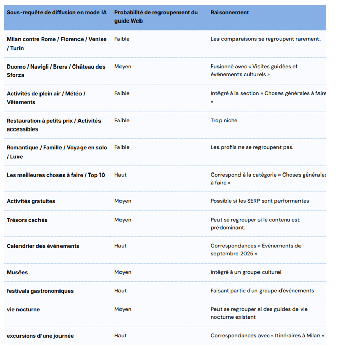| 3. Déploiement en éventail (fan-out) | Génère des sous-requêtes thématiques | Génère des diffusions larges et orientées vers un objectif précis | Créer des pages pour les sous-requêtes de cluster probables (concerts, itinéraires) | Couvrir tous les aspects, y compris les profils et l’accessibilité |