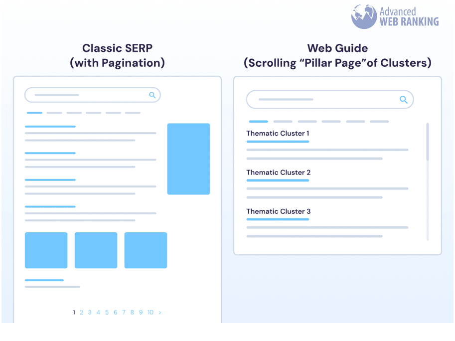Le changement le plus radical introduit par le Web Guide est l’abandon de la structure que nous connaissons depuis des décennies. Dites adieu à la pagination traditionnelle (« page 1, 2, 3… »). À la place, Google présente une structure unifiée qui s’apparente à une immense « page pilier » générée à la volée. Mais sa composition est cruciale. La page s’organise désormais en trois temps :