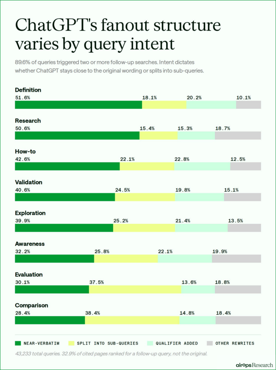 - Intentions Informationnelles (Définitions) : ChatGPT reste conservateur. Dans 51,6 % des cas, les requêtes de fan-out pour des définitions sont quasi-identiques à l’original. Ici, la profondeur et l’autorité sémantique priment.