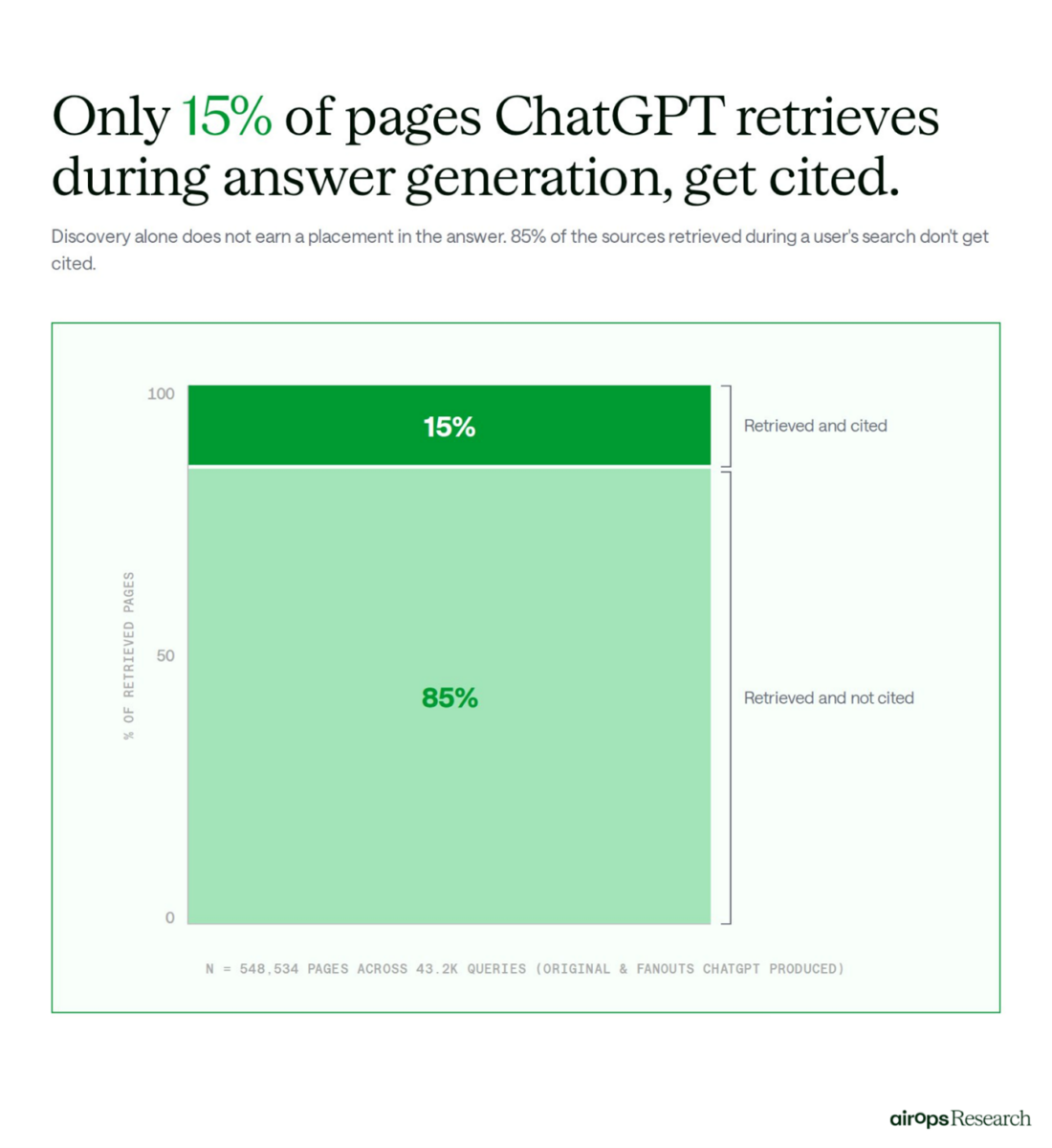 L’étude AirOps révèle une statistique brutale : sur 548 534 pages consultées par ChatGPT, 85 % ne sont jamais citées. Être « récupéré » (retrieved) par l’IA n’est que le ticket d’entrée ; cela ne garantit en rien une place dans la réponse finale.