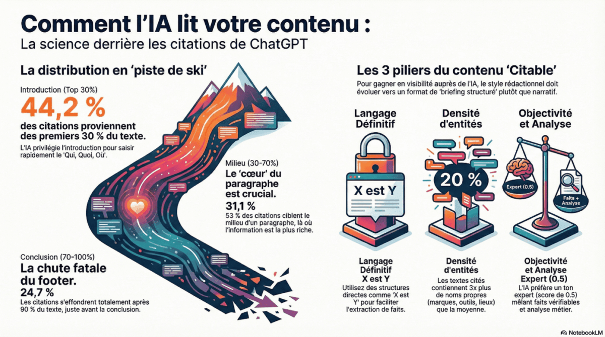 L’étude des citations identifie un motif systématique baptisé par Kevin Indig la distribution en « tremplin » (ski ramp). L’IA accorde une pondération vectorielle disproportionnée au premier tiers de votre contenu.