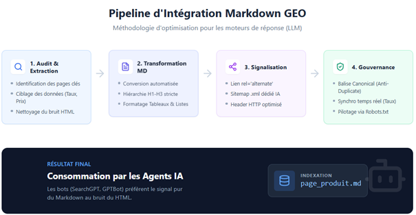 Pour ceux qui franchissent le pas, l’implémentation ne doit pas être artisanale. Elle doit suivre un pipeline rigoureux : Audit -> Transformation -> Signalisation -> Gouvernance.