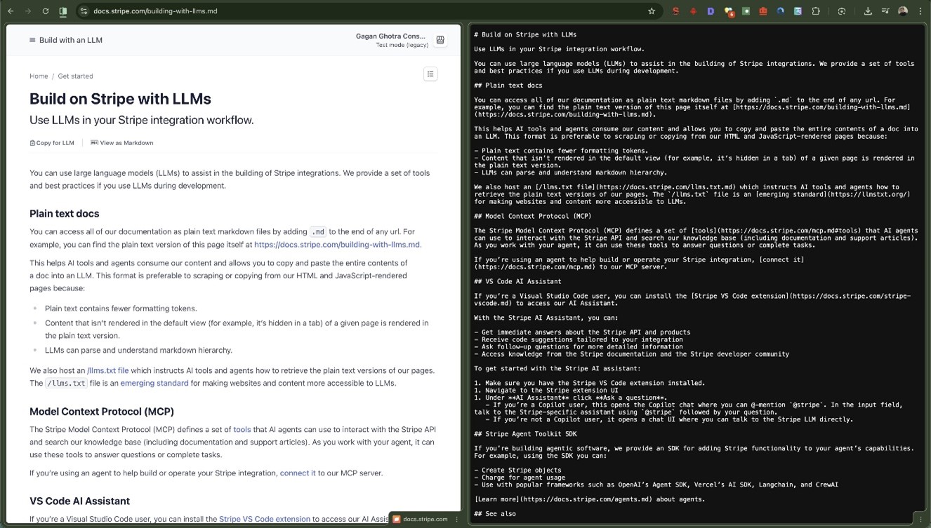 Les leaders technologiques comme Stripe ont déjà adopté cette dualité. Sur leur sous-domaine de documentation pour développeurs, chaque page possède un double numérique. En ajoutant simplement l’extension .md à n’importe quelle URL, Stripe sert une version épurée, optimisée pour être injectée directement dans un assistant de code ou un LLM.