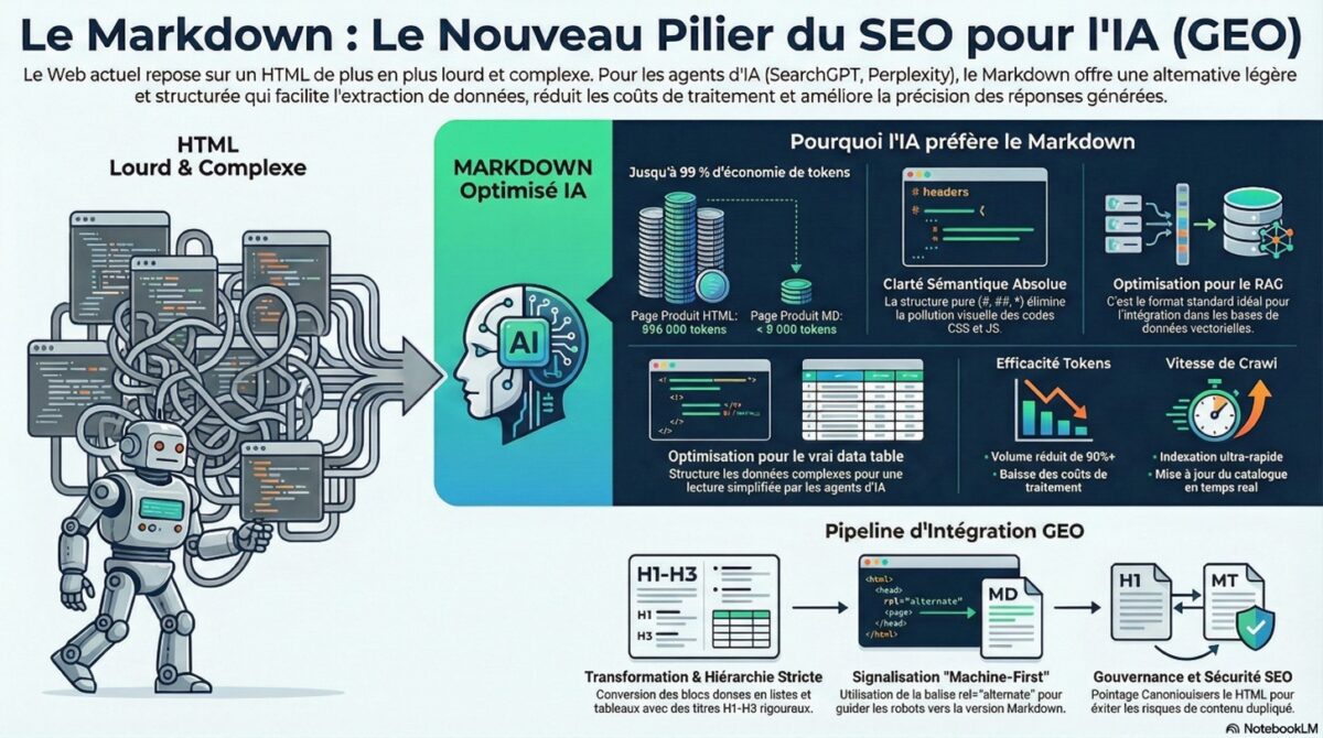 Dans cette transition vers la Generative Engine Optimization (GEO), le Markdown — autrefois simple outil de mise en forme pour développeurs — s’impose comme une couche stratégique fondamentale. Ce n’est plus une simple tendance technique, mais une évolution d’infrastructure : transformer son site pour qu’il devienne « Machine-First ».