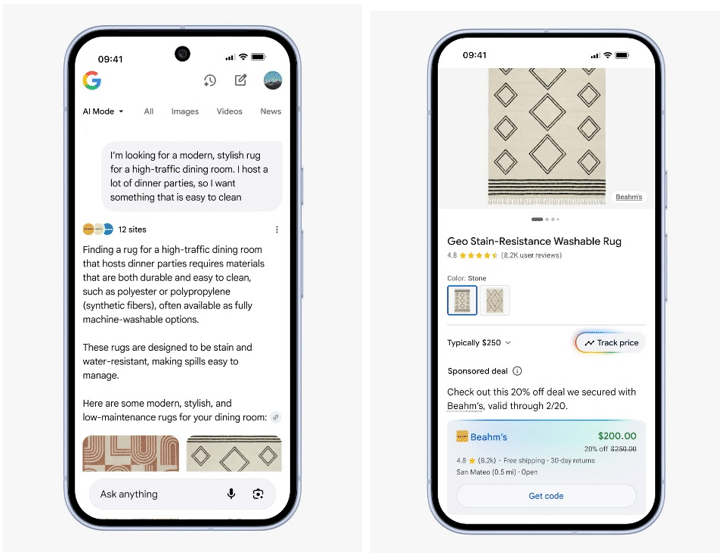 Google met déjà en avant les produits les plus pertinents, mais désormais, les vendeurs peuvent proposer une réduction spéciale (par exemple 20%) directement dans l’interface IA pour conclure la vente.