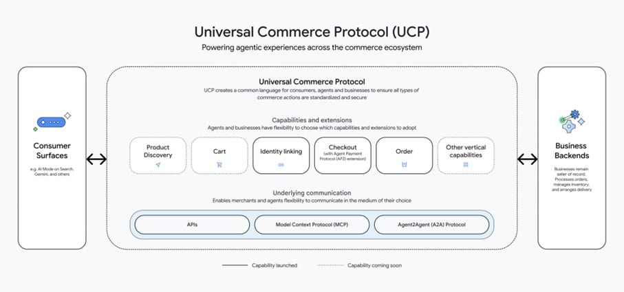 Au lieu d’exiger des connexions uniques pour chaque agent, l’UCP facilite l’interaction entre tous les agents. Conçu pour fonctionner dans différents secteurs, il est compatible avec les protocoles existants tels que Agent2Agent (A2A), Agent Payments Protocol (AP2) et Model Context Protocol (MCP).