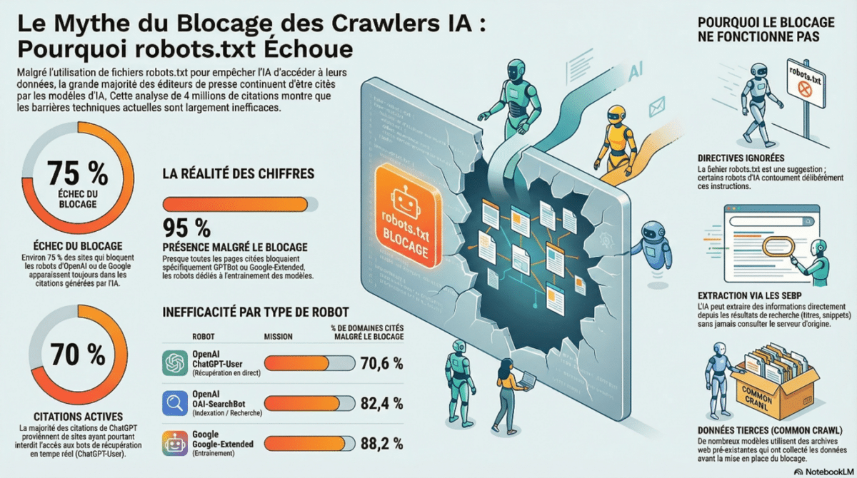 L’une des raisons de cette porosité réside dans la distinction technique entre les robots d’entraînement (training) et les robots de récupération en direct (retrieval). Les données montrent que 95 % des pages citées bloquaient pourtant les robots d’entraînement comme GPTBot ou Google-Extended.