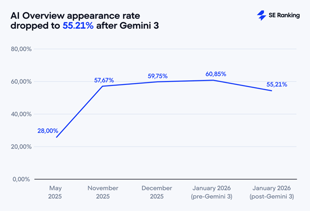 Depuis son lancement, l’IA dans la recherche suivait une trajectoire exponentielle. En mai 2025, les Aperçus IA ne concernaient que 28 % des requêtes. En décembre, ce chiffre frôlait les 60 %. Mais avec Gemini 3, cette marche forcée vient de subir son premier coup d’arrêt.