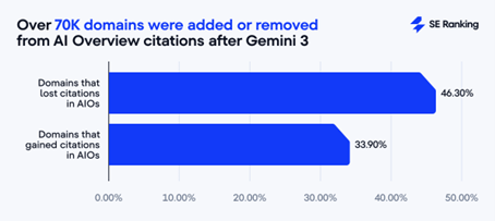 Sur les 89 262 domaines uniques cités avant Gemini 3, 41 336 (46,3 %) ont complètement disparu des citations d’AIO après son déploiement. Cela représente près de la moitié des domaines précédemment cités qui n’apparaissent plus dans les aperçus d’IA.