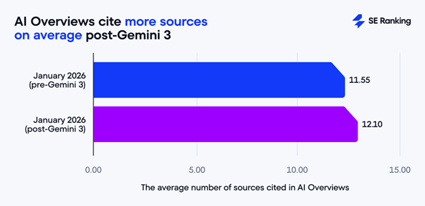 | Nombre de sources par réponse | Pré-Gemini 3 | Post-Gemini 3 | Évolution Relative |