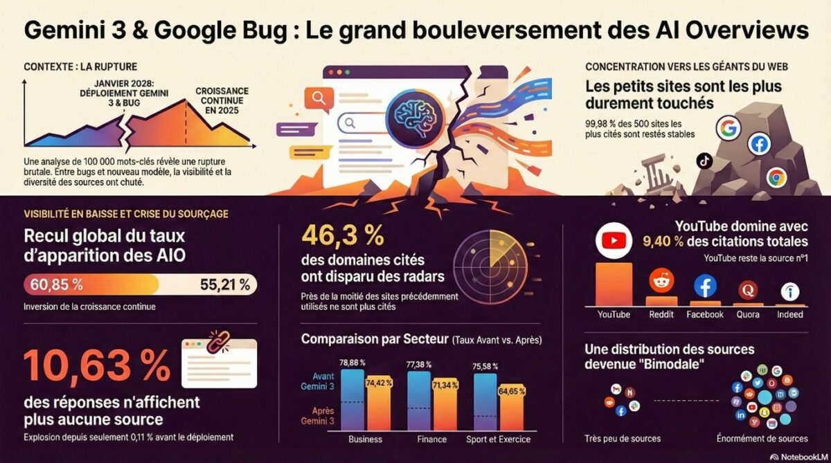 Nous sommes à la croisée des chemins. Si Google maintient la thèse du bug technique pour justifier la disparition des sources, les changements structurels apportés par Gemini 3 — réduction du nombre de domaines uniques, explosion du sans-source et concentration vers YouTube — suggèrent une stratégie délibérée.