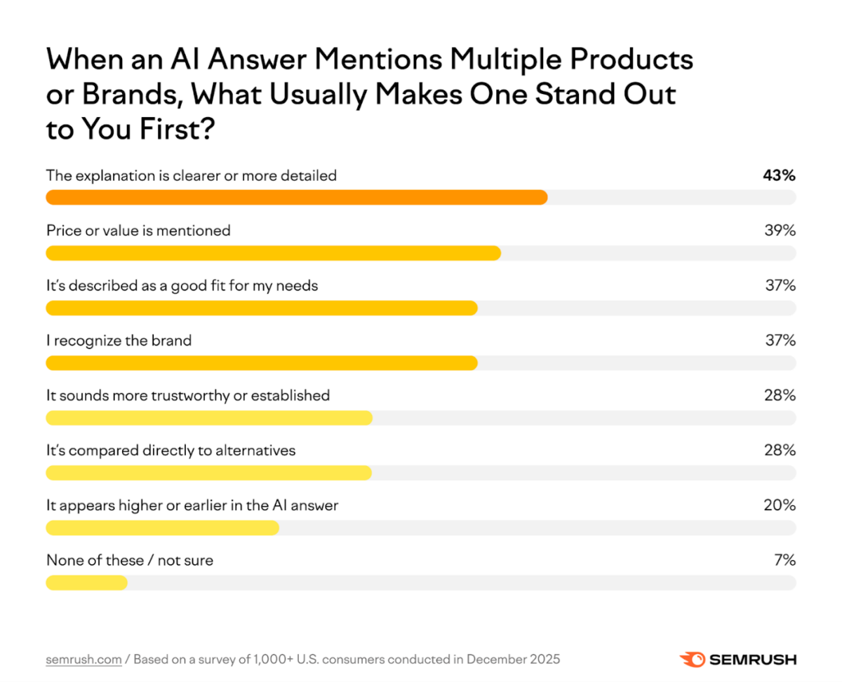 Le vieux dogme du SEO, « la première place ou rien », est en train de s’effondrer. Étonnamment, seuls 20 % des utilisateurs jugent primordial d’être cités en premier par l’IA. La véritable monnaie d’échange est désormais la pertinence contextuelle. En effet, 52 % des acheteurs soumettent des contraintes précises dès leur premier prompt (budget, fonctionnalités spécifiques ou usage métier), forçant l’IA à justifier ses choix.