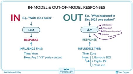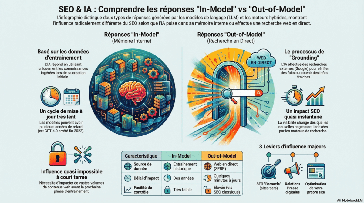 Pour naviguer dans cette nouvelle ère, il est crucial d’adopter la distinction fondamentale établie par Tom Capper (Moz) entre les réponses « In-Model » (internes au modèle) et « Out-of-Model » (externes au modèle). Les réponses In-Model sont générées à partir des connaissances figées lors de l’entraînement initial de l’IA. À l’inverse, les réponses Out-of-Model interviennent lorsque l’IA déclenche une recherche web en temps réel pour combler une lacune ou vérifier une information.