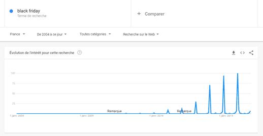 Pourtant, 2016 connaît un boom du Black Friday : toutes sortes de sites e-commerce, notamment ceux spécialisés dans les vêtements et les jeux, profitent de cet événement commercial pour promouvoir leurs produits et augmenter ainsi leurs ventes de fin d’année. L’expression « Black Friday » atteint alors près de 3 millions de recherches*.
