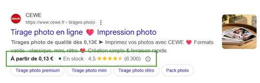 Ci-dessous, la zone encadrée en vert est générée par Google grâce aux données structurées Product.